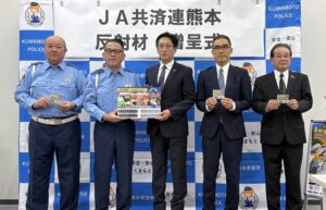 贈呈式ではJA共済連熊本の橋本明博本部長が、県警の合瀨勝彦交通部長へ反射ステッカーを手渡した。橋本本部長は「交通安全の啓発に向けて役立ててほしい」と話した。