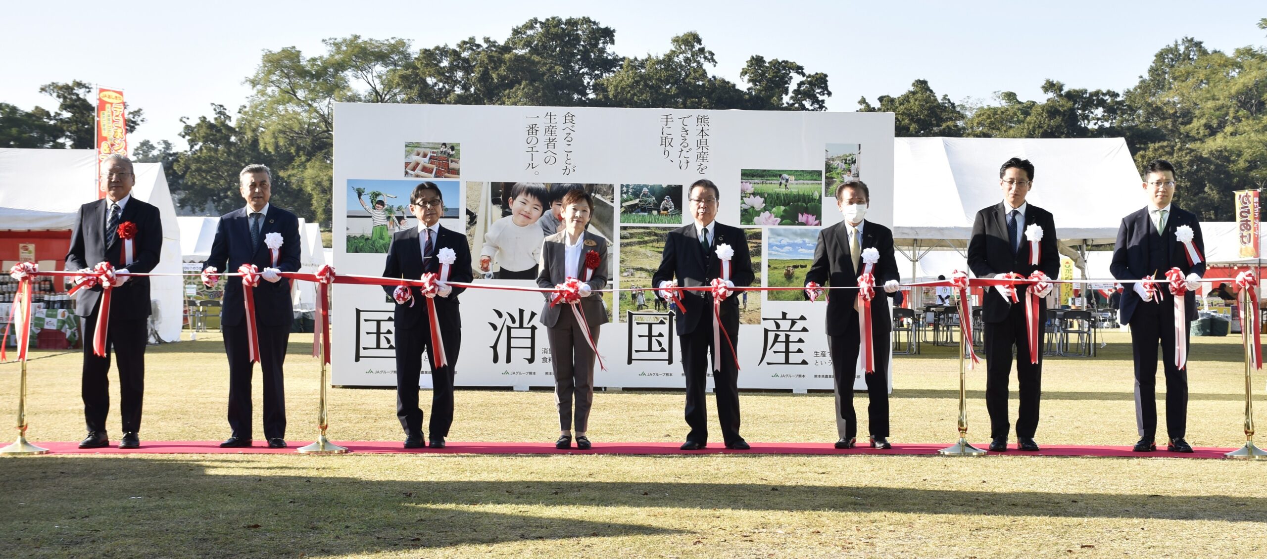 実行委会長を務めるJA熊本中央会の宮本隆幸会長は「生産者は厳しい環境の中、安全・安心な農畜産物を消費者に届けるため精いっぱい頑張っている。食料安全保障を確立し、食料・農業を未来につないでいくため農業フェアを通じて食や農業について理解を深めてほしい」とあいさつした。会場では大型パネルの設置やちらしを配布し、来場者に国消国産の重要性を訴えた。