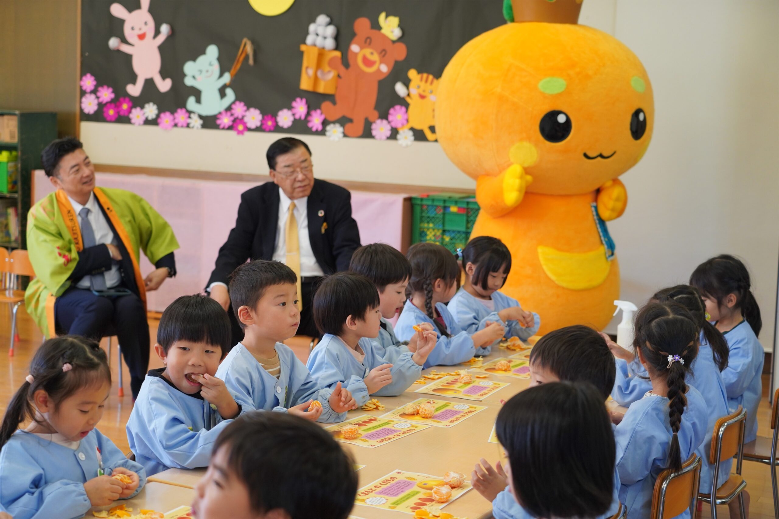 セレモニーでは、園の先生が「みかんのおはなし」の紙芝居を読み聞かせた。「ミカンの花はどれ?」などクイズも盛り込まれ、おいしいミカンができるまでを伝えた。園児らが1人1個ミカンをむいて試食すると、「おいしい、お代わり」と声が上がった。橋本会長は「熊本のミカンを届けるために、ジューシーくんと熊本から来た。おいしいミカンを食べて、もっと好きになってほしい」とあいさつした。