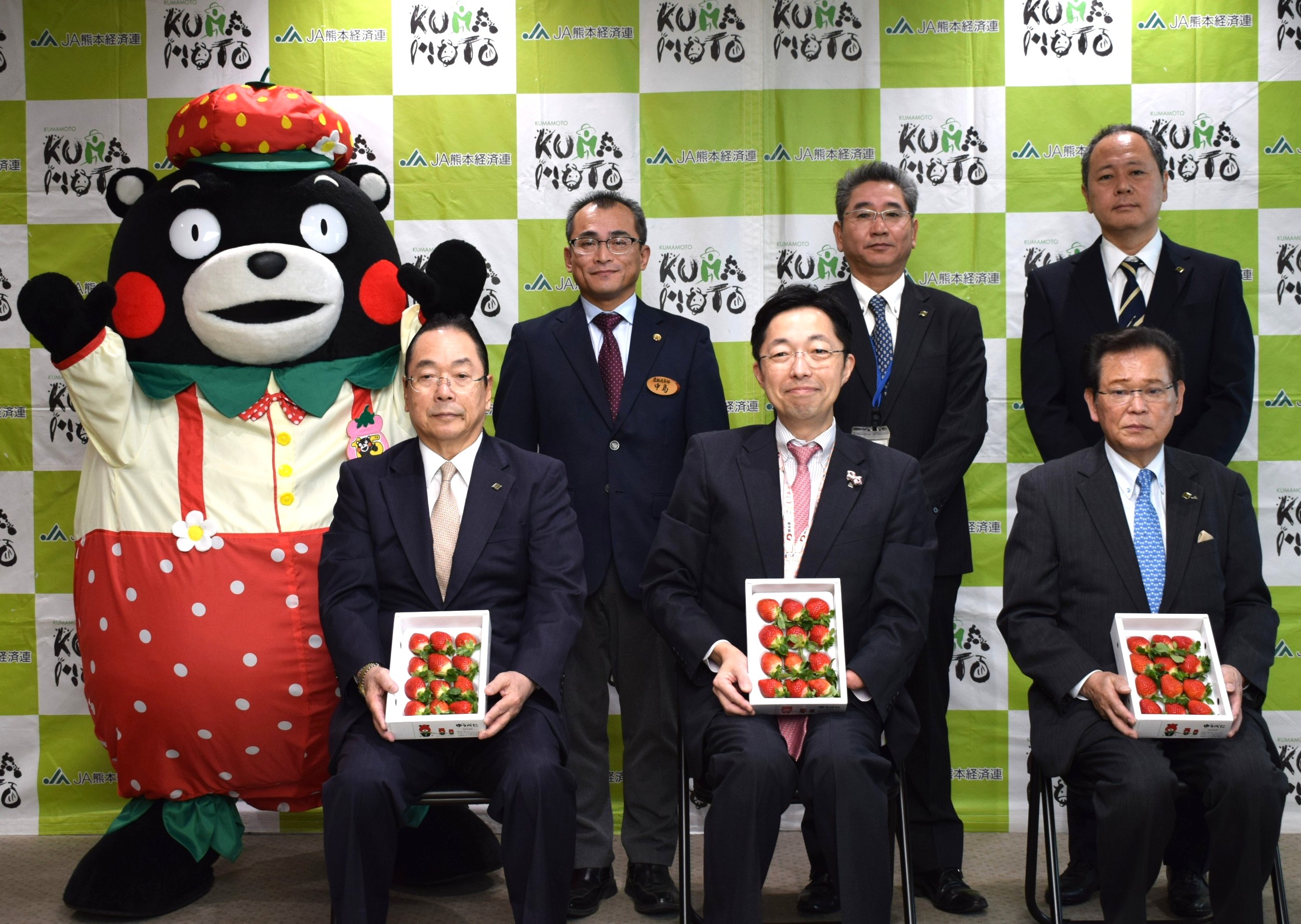 丁道夫会長は「昼夜の寒暖差があり食味は良く高評価を得ている。豪雨災害を乗り越えたイチゴを食べてほしい」と話す。木村知事は「熊本が誇るイチゴ。全国の消費者に届くようにくまモンとPRしていく」と述べた。