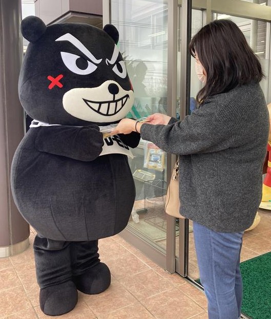 12月25日、JA熊本市小山戸島支店で特殊詐欺対策のために誕生した県警のマスコット「ワルモン」も登場。利用者にちらしなどを手渡し、注意を呼びかけた。