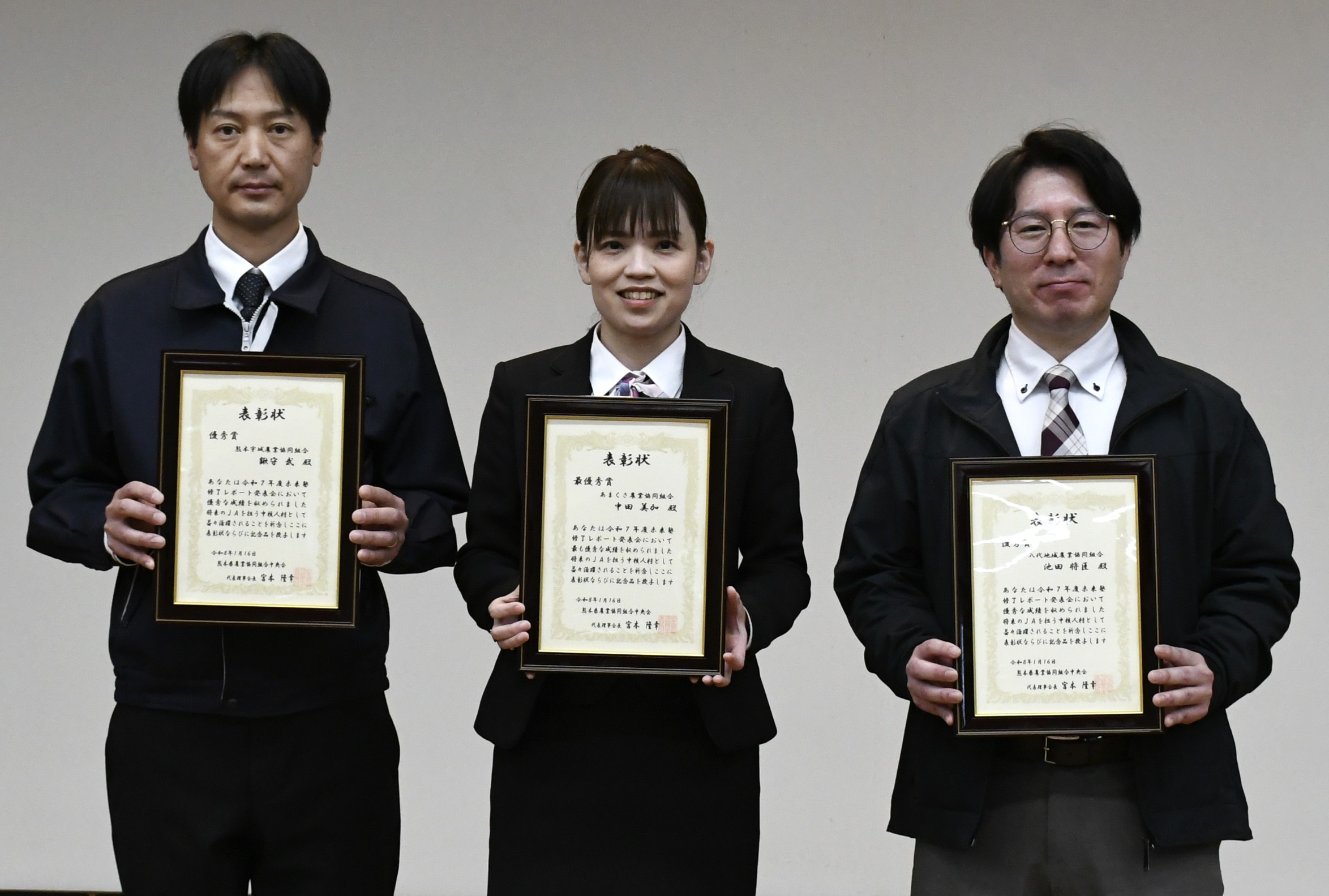 最優秀賞に選ばれた中田さんは2月20日に東京で開かれる「第17回JA戦略型中核人材育成研修全国研究発表会」に熊本県代表として出場する。他の受賞者は次の通り。かっこ内はJA名。