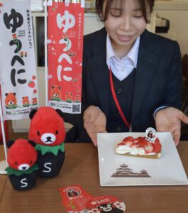 ケーキのベースには熊本県産和紅茶を使用。「ゆうべに」の甘酸っぱさとの相性は抜群。和紅茶の赤と「ゆうべに」の赤で「火の国くまもと」を表現している。店内で飲食する場合、熊本地震復興のシンボル・熊本城を皿にデコレーションし、見た目にも華やかだ。
