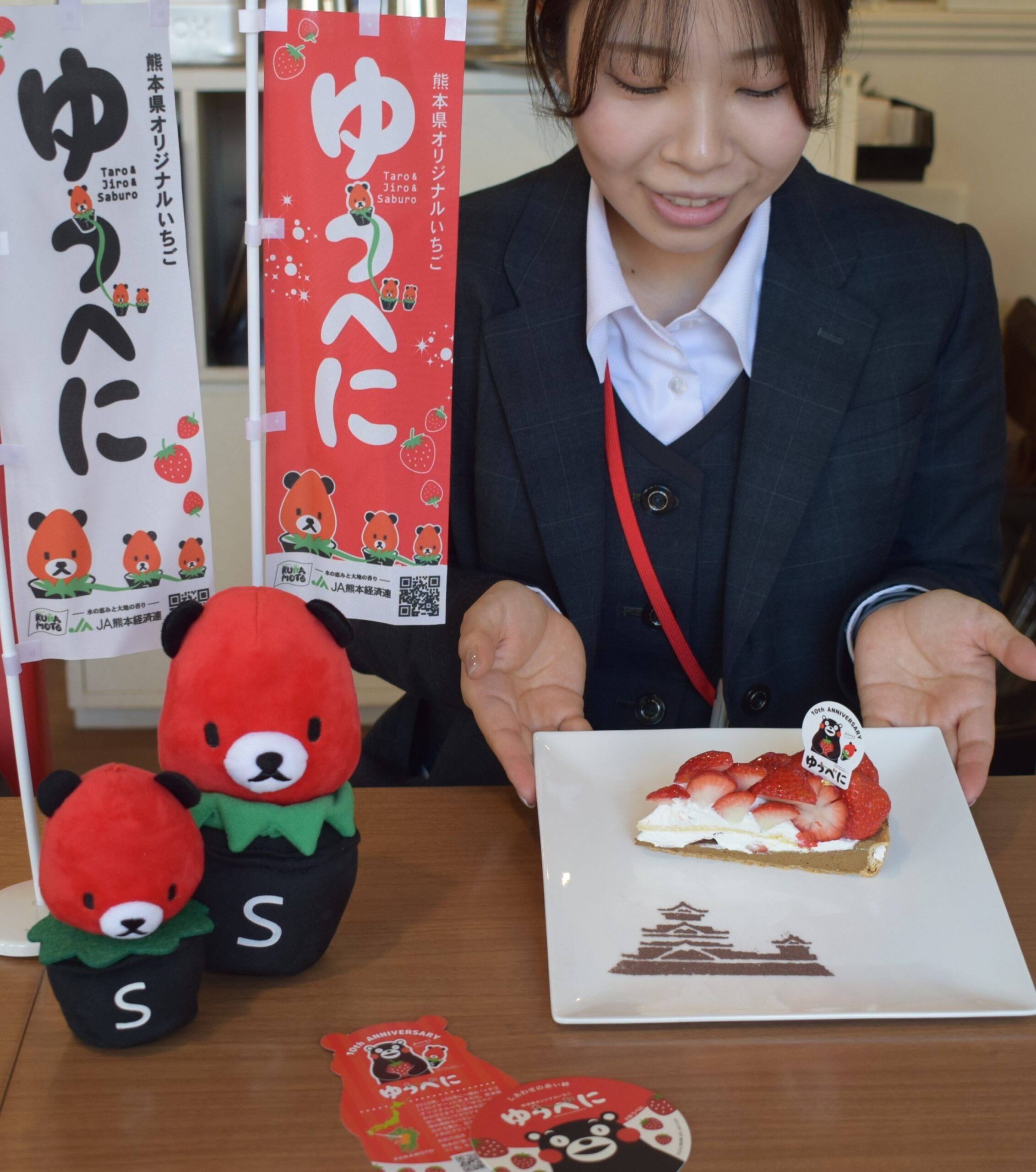 全国のカフェコムサで、14日まで、熊本県オリジナルイチゴ「ゆうべに」の誕生10周年を祝う特別なケーキを発売中だ。
