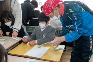 JA熊本うきイ草生産部会員で、宇城市小川町住吉地区の農家6人で構成する「小川草心会(そうしんかい)」は2日、宇城市立河江小学校に出向き、同校3年生に畳表を使った写真フレーム作りを指導した。イ草の魅力を広めようと、今年で16回目の取り組み。児童84人は、授業参観で訪れた家族と一緒に体験し、地元産のイ草の良さに触れた。