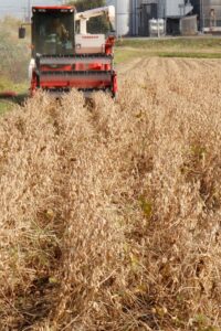 熊本市東区の農事組合法人秋津営農組合は11月上旬、大豆「フクユタカ」の収穫を始めた。台風もなく生育時の天候に恵まれ、昨年並みの1週間ほど早い収穫となった。コンバイン5台で65ヘクタールを刈り取った。