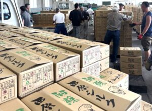 初出荷では、約2000ケース(1ケース5キロ)の持ち込みがあった。部会員59人、作付面積は80ヘクタールで県内や関西、東海地方への出荷を予定している。9月から6月まで出荷し、販売数量1770トン、販売金額5億5000万円を目指す。