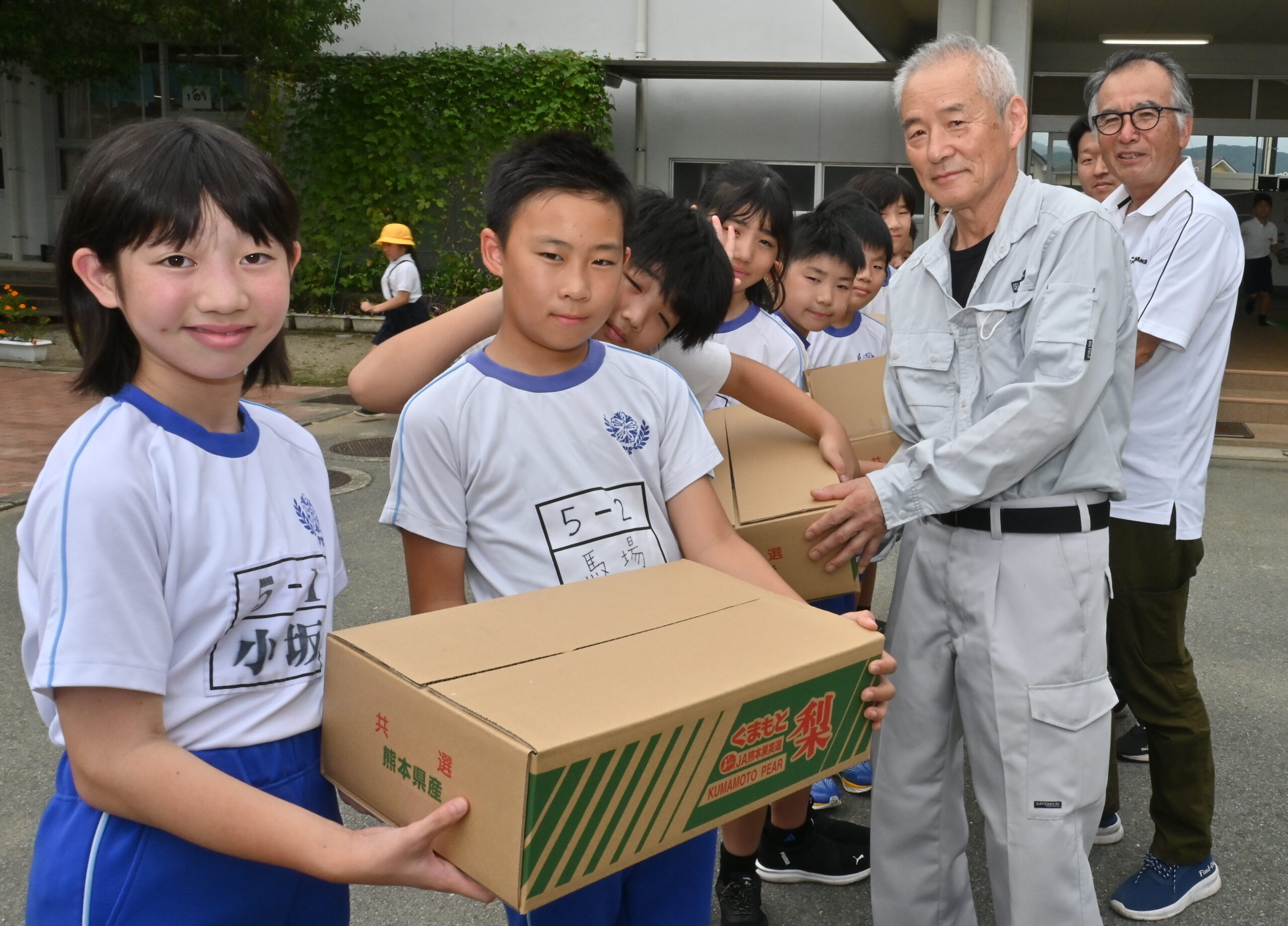 JA鹿本ナシ部会は9月24日、子どもたちに地元産の農産物を味わってもらい、郷土愛を育んでもらおうと、山鹿市立めのだけ小学校へ「新高」(5ケース、5キロ入り)を贈った。城眞也部会長ら3人が児童の代表10人に梨を手渡した。城部会長は「地元特産の梨をたくさん食べて、勉強やスポーツに頑張ってください」と話した。