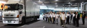 JA熊本市柑橘(かんきつ)部会は9月下旬、極早生ミカン「豊福」の出発式をJA熊本市柑橘選果場(西区河内町)で開いた。部会役員、九州産交運輸、児島段ボール、JA職員ら約30人が参加。初出荷の「豊福」を積み関東へ出発するトラックを、参加者全員で見送った。
