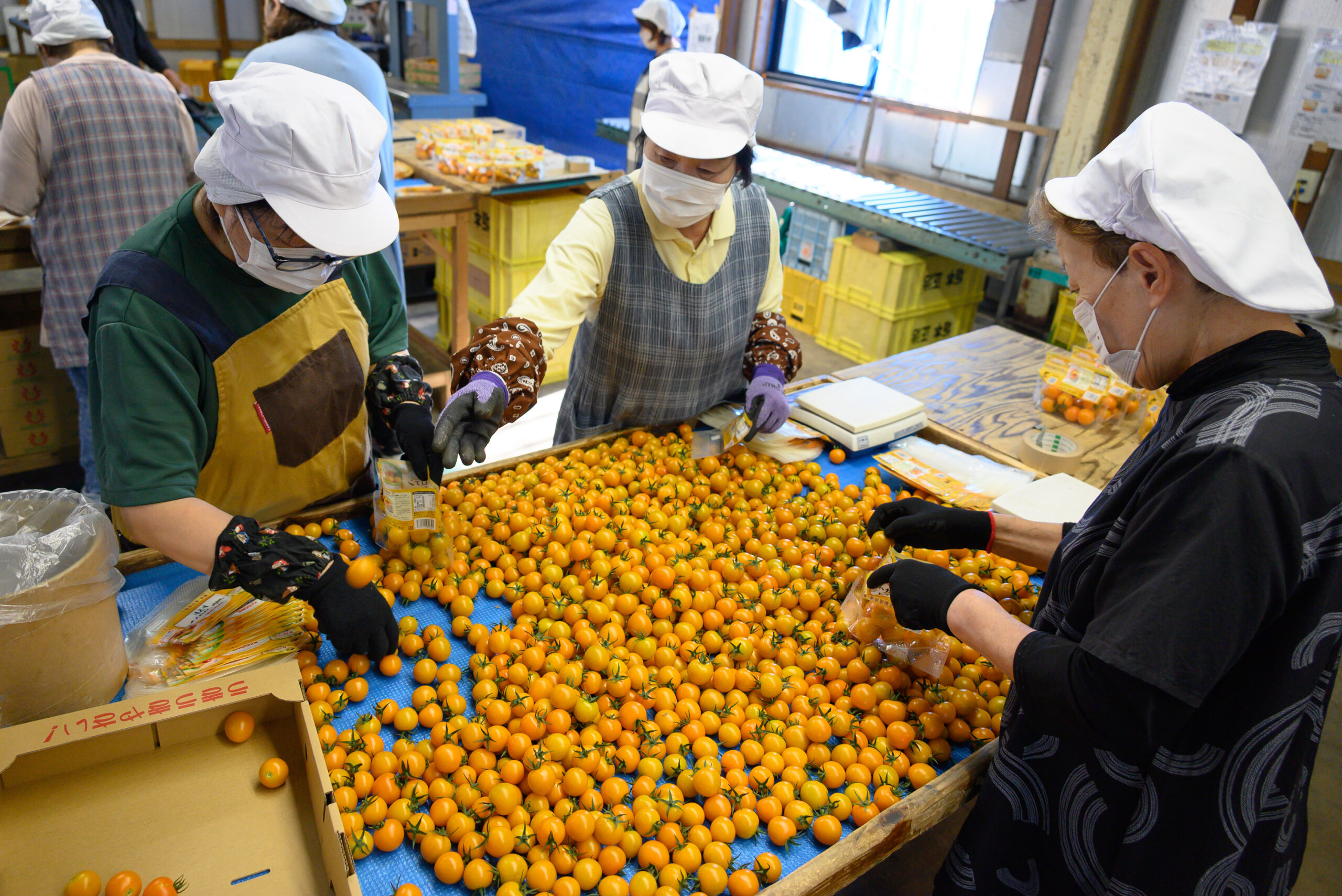 同センターでは、オリジナルブランド「くまもと塩トマト」や「アイコミニトマト」、契約販売品となる「アンジェレ」、その他メーカー品のトマト類を選果する。取り扱う出荷規格が多く40種類以上にもなるため、作業員は内容を確認しながら丁寧な選果に努めている。