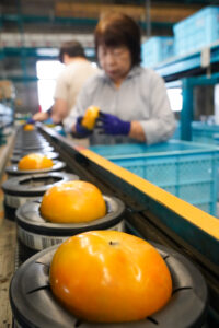 玉名市の中央みかん選果場では、従業員が軟果や傷の有無などを確認しながら選別している。指導販売担当者は「品質が良く、おいしい柿ができている。旬の味覚を多くの人に味わってほしい」と話した。