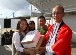 お楽しみ抽選会の当選者と記念撮影する田原要一組合長