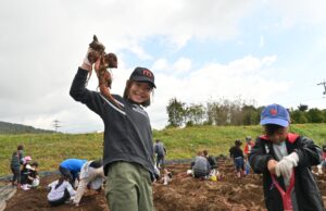 当日は52組の親子をはじめ、管内の小学生、地域住民ら約150人が参加した。事務局が収穫の手順を説明した後、参加者はスコップを手に次々と掘り出した。1時間ほどで各家庭がビニール袋いっぱいに掘り終え、参加した親子は「大変だったけど楽しかった」と笑顔を見せた。