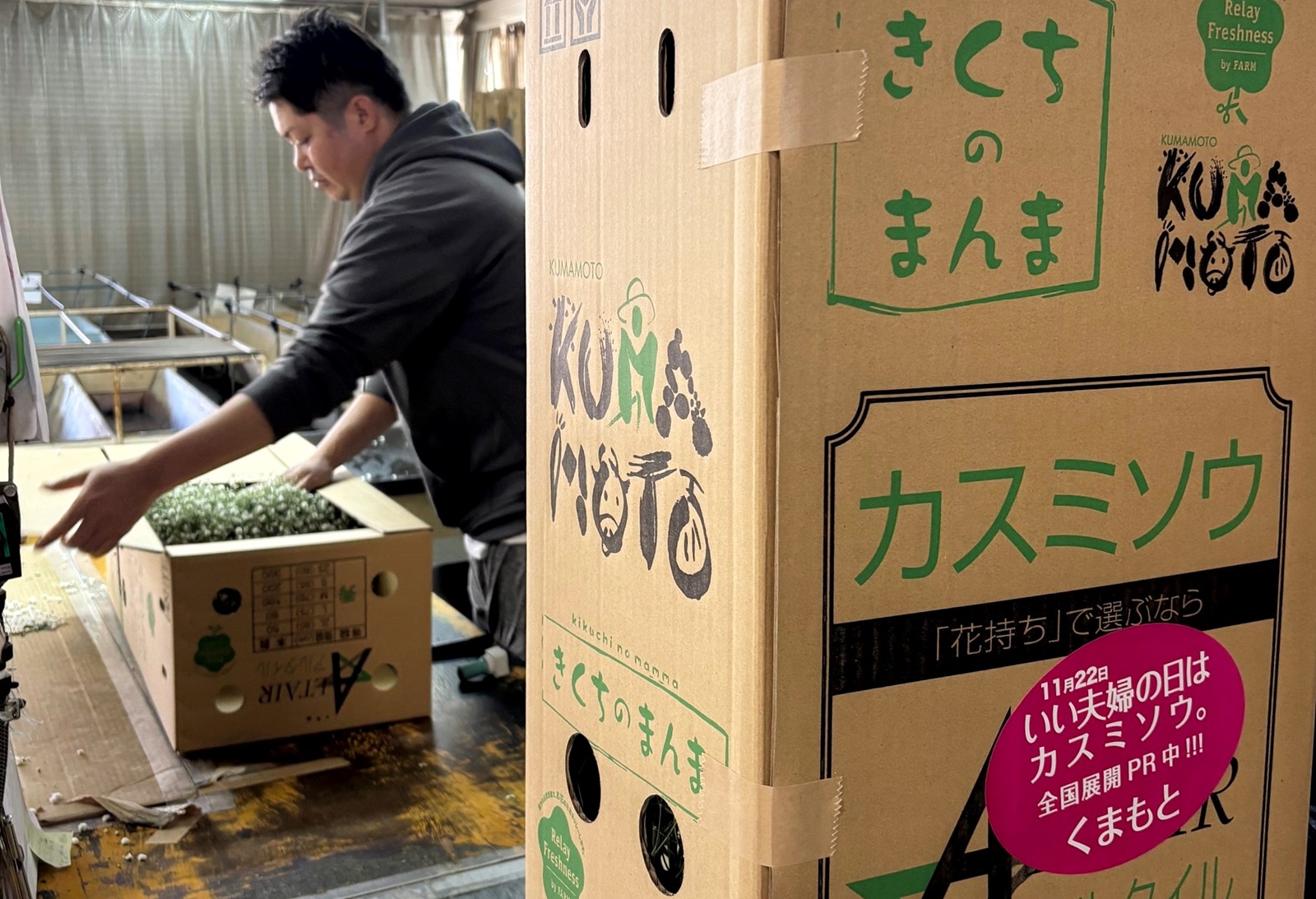 JA菊池北営農センター(菊池市)で、宿根カスミソウの出荷が進む。11月22日の「いい夫婦の日」に向けて出荷箱に「いい夫婦の日はカスミソウ」の県内JAグループ特製シールを貼りPRに注力する。