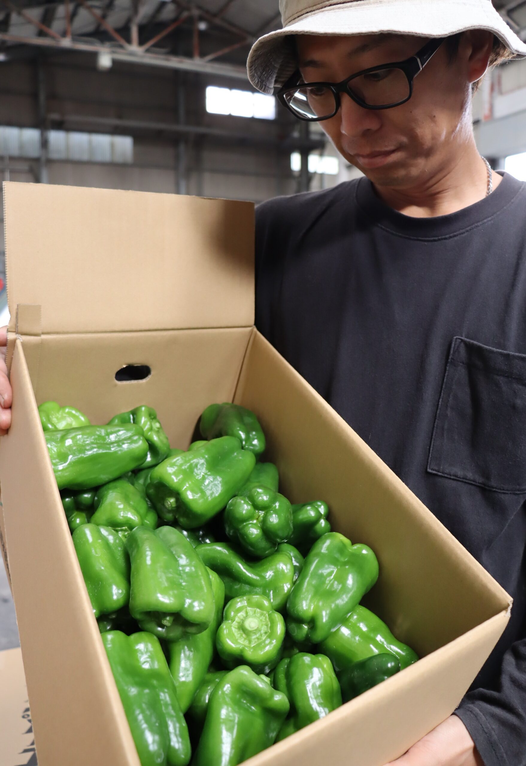 部会は県内で唯一、品種「エースピーマン」を栽培する。12人が3ヘクタールで作付けする。全部会員が農薬を減らすため天敵を導入し、品質向上に努める。10日、JA東部支店の集荷場には28ケース(1ケース4キロ)が持ち込まれた。