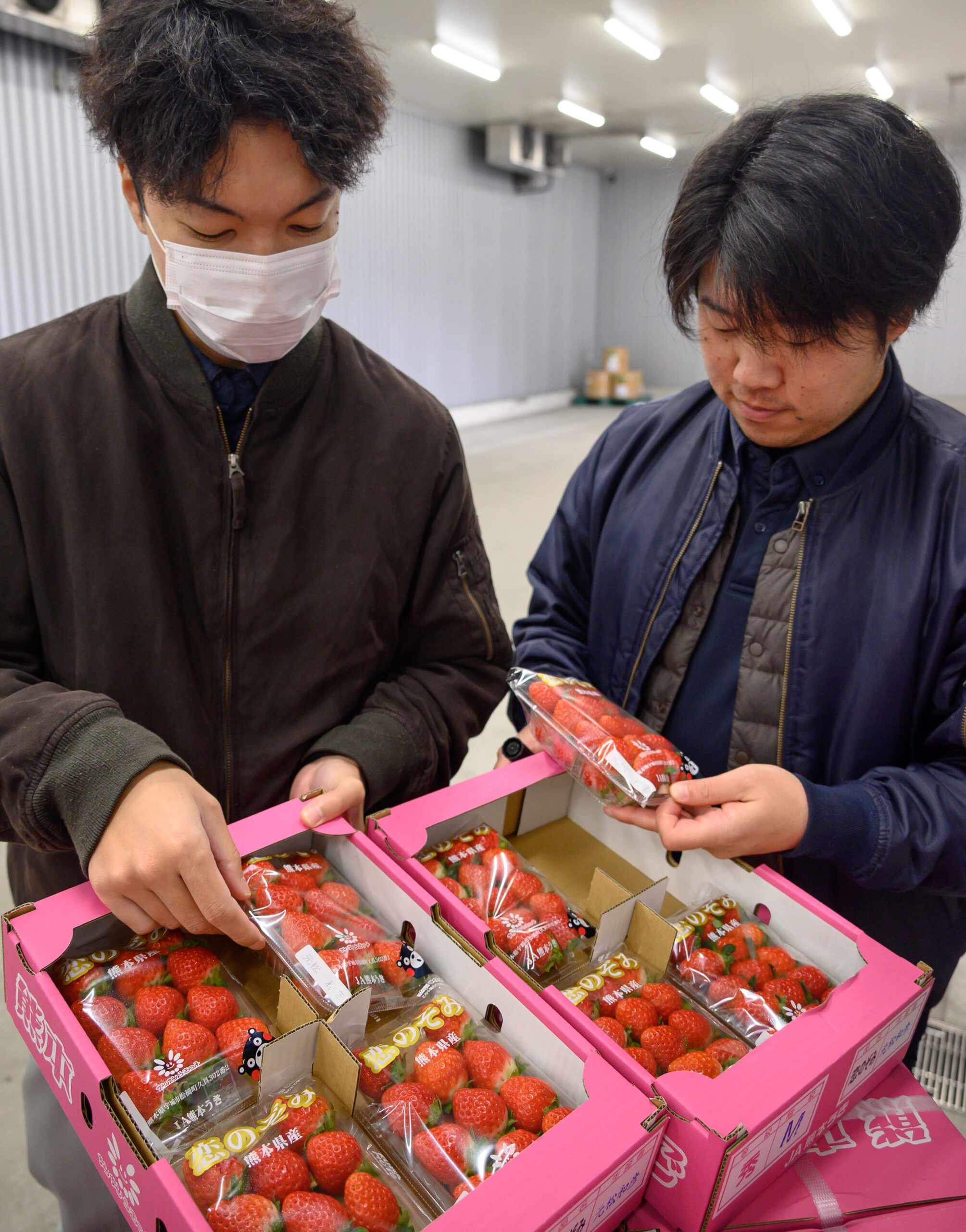 11月25日、イチゴ300パック(1パック250グラム)を出荷した。12月中旬から出荷量が増え始め、年末から年明けにピークを見込んでいる。26年6月までに総出荷量348トンを目指す。
