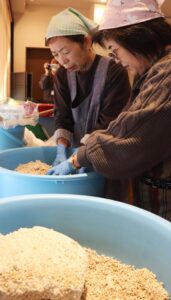 参加者からは「身近にあるみそがどのように作られているのか知りたくて参加した。発酵した麦こうじを触り、こうじの香りや人肌に温かくなることを体感でき、貴重な体験ができた」「作ったらすぐ食べられると思ったが、発酵させる時間が3カ月ほど必要なのを知った。完成まで家で育てて春頃に食べるのが楽しみ」など笑顔の声があふれた。