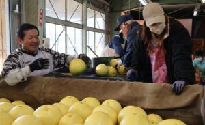 JAやつしろ果実選果場(八代市)で11月下旬、加温ハウス栽培「晩白柚(ばんぺいゆ)」を初選果した。