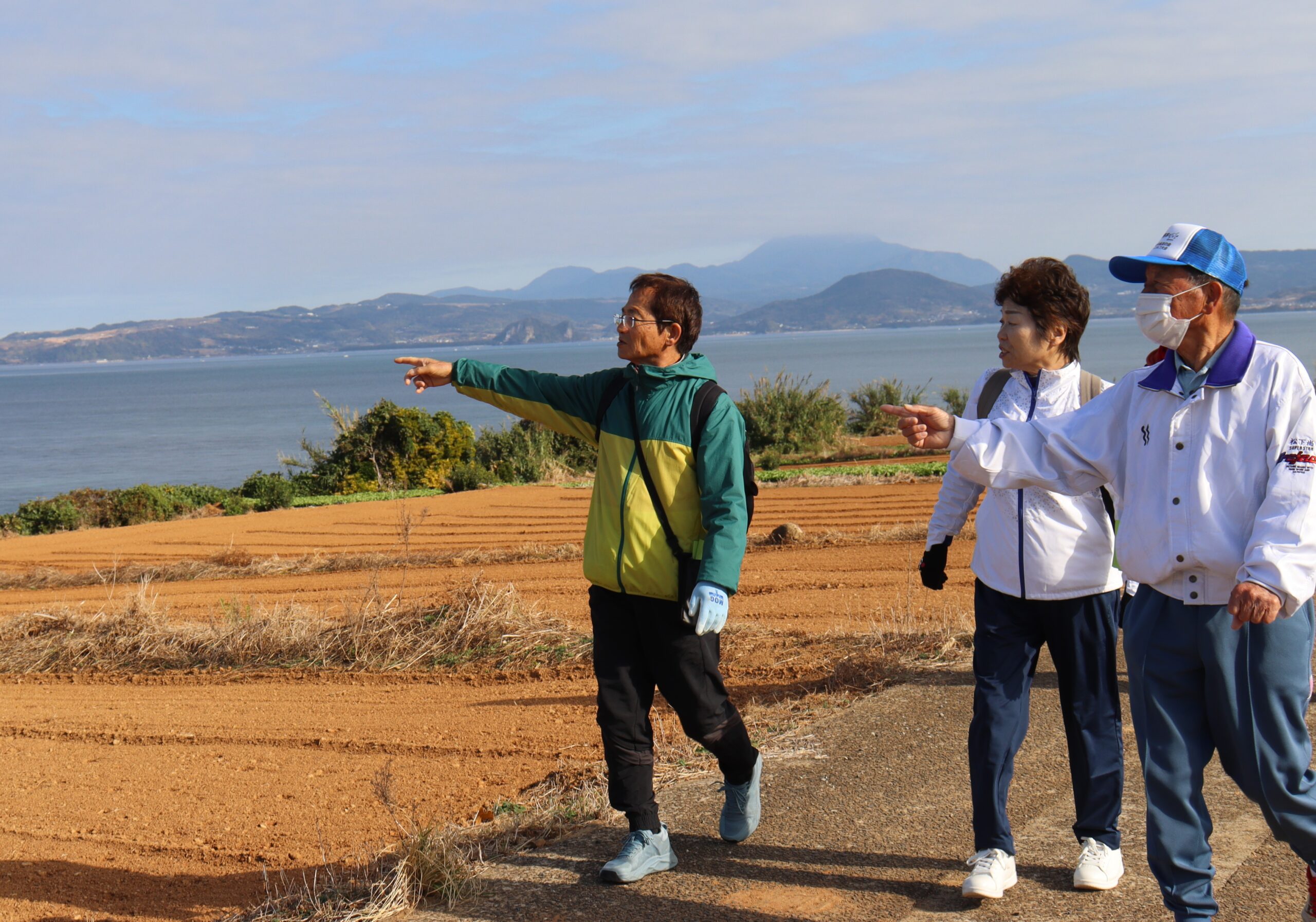 参加者は、二江地区の港町の風景や島原半島を望みつつ風力発電跡を歩き、初冬の自然の景色を楽しんだ。収穫作業中の農家とあいさつする参加者もみられた。ゴール後はおにぎりと豚汁を振る舞い、お楽しみ抽選会を行った。参加者は「天候にも恵まれ気持ちよく歩けた。次回もぜひ参加したい」と笑顔で話した。