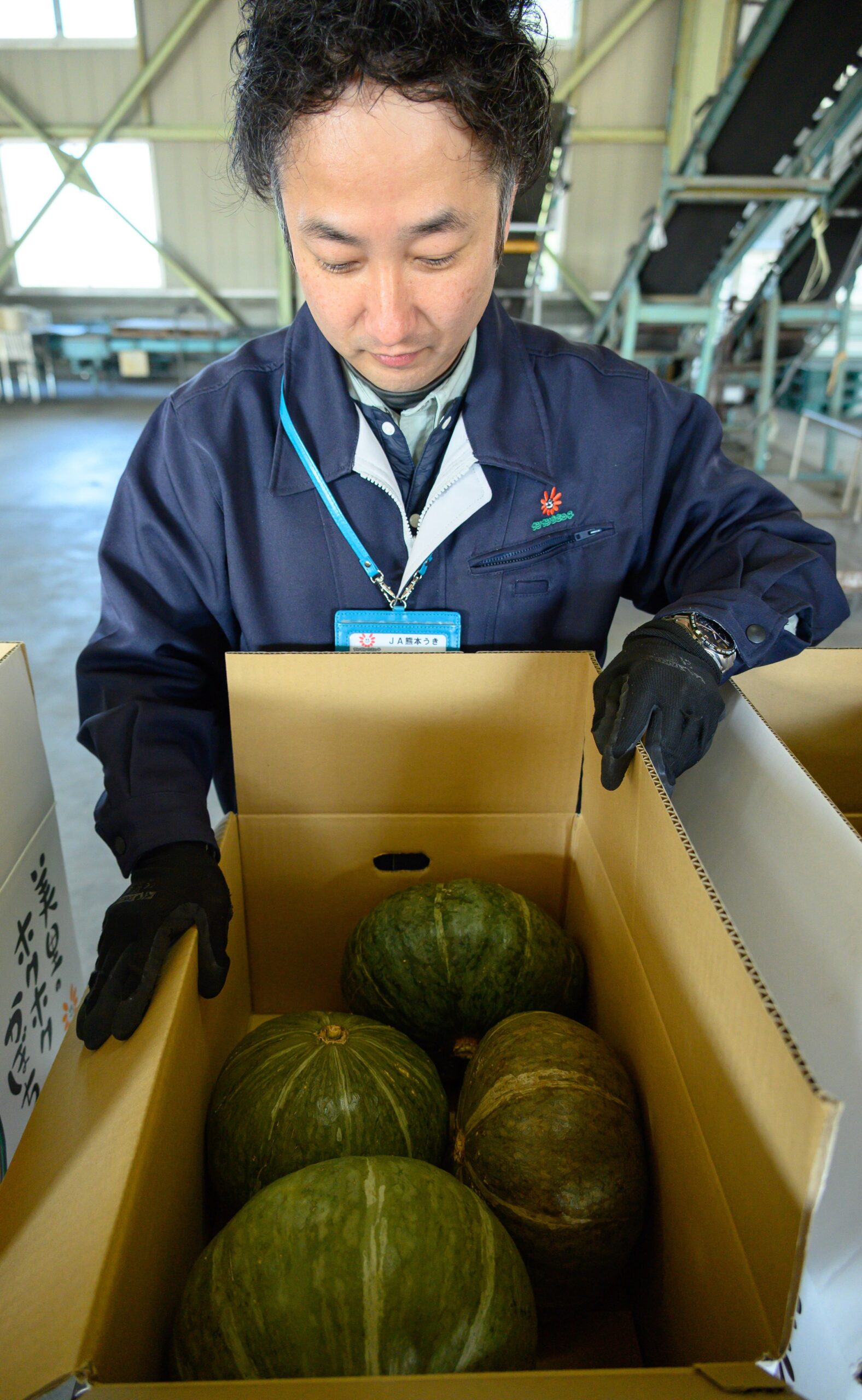 東営農センターの髙田章吾主任は「新品種の導入で、昨年より大玉傾向に仕上がっている。検査を徹底し、安定品質の美里カボチャの出荷に努めたい」と話した。