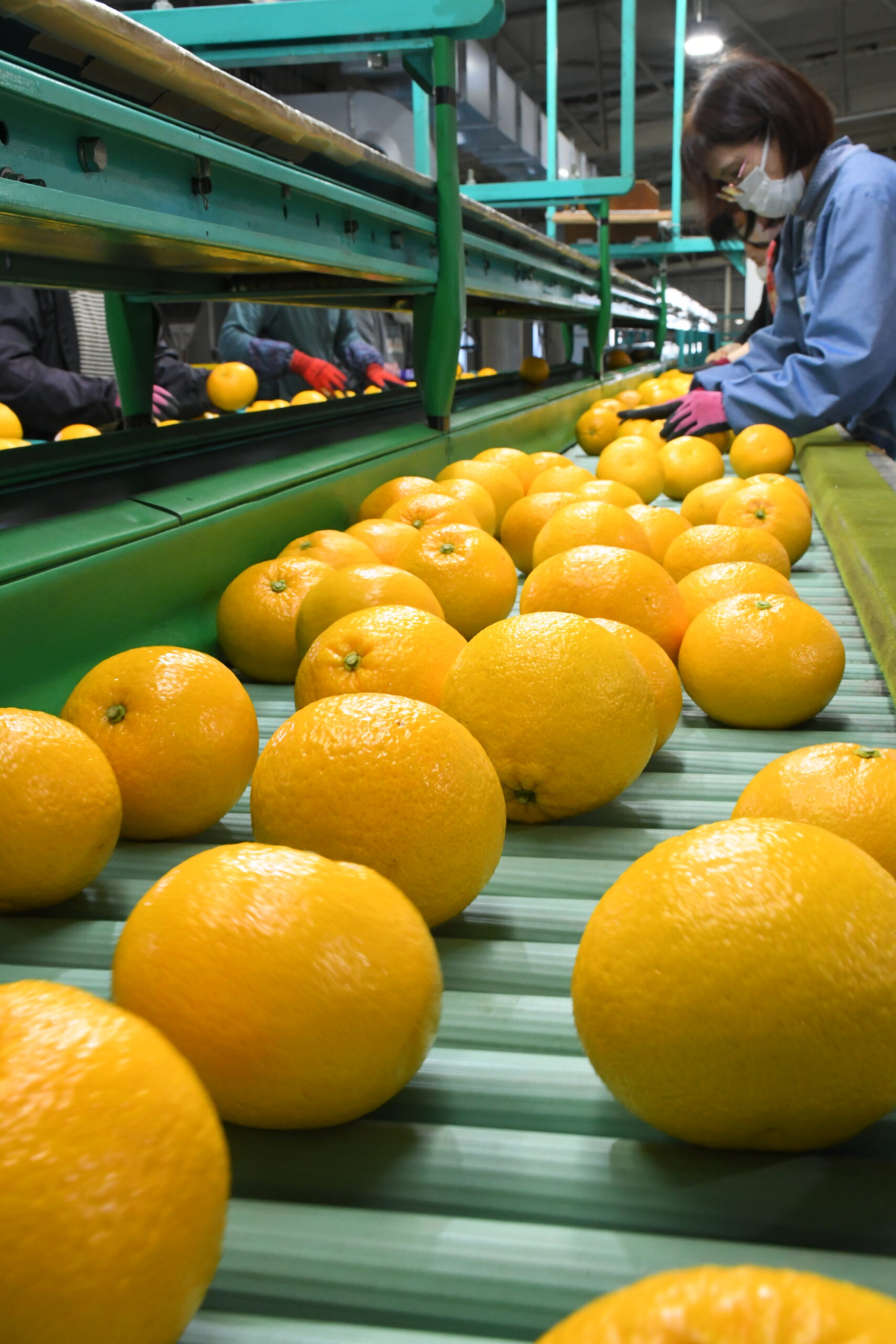 芦北町のマルタ選果場では1月中旬から選果が始まった。香りが良く、甘味の中に酸味があり、爽やかな甘酸っぱさが楽しめるのが特徴だ。