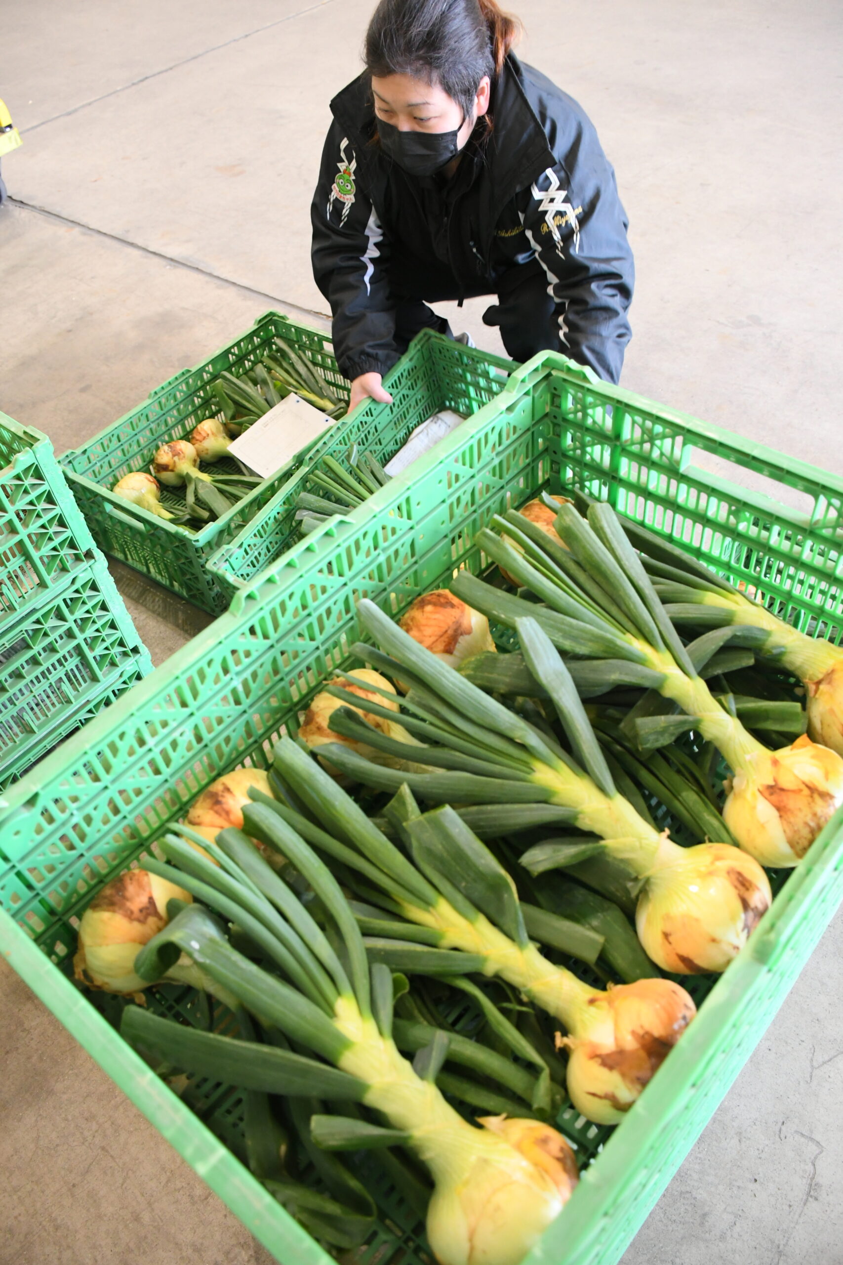 JAあしきたは1月下旬、特産タマネギ「葉付きサラたまちゃん」の出荷を始めた。持ち込んだタマネギを生産者が一つ一つ手作業で箱詰めし、初日は35ケース(20玉入り)を全国へ出荷した。