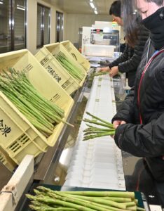 同日、山鹿市菊鹿町にあるJA菊鹿選果場では、生産者が持ち込んだ約30キロのアスパラガスを選果、箱詰めし、県内の市場へ出荷した。JA営農指導課の福島將文さんは「直近の低温の影響で出荷量は少ないが、品質は良好。これから出荷者が増え出荷量も徐々に伸びていく。今後に期待したい」と話す。