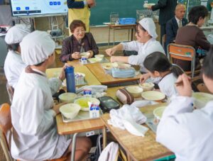 児童代表の猿渡芽映さんは「心を込めて作ったみその提供に感謝。地元の大豆を使ったみそはどんな味がするのか楽しみ。味わって食べたい」と述べた。「根菜みそ汁」が振る舞われ、児童からは「おいしい」「もっと食べたい」など笑みがこぼれた。