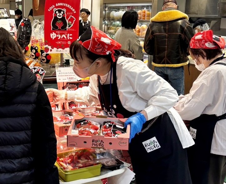 JA菊池イチゴ部会は2月中旬、フレッシュワン大丸東京店(東京都千代田区)で販売促進会を開いた。旬を迎えた熊本県オリジナルイチゴ「ゆうべに」の魅力を発信しようと開催。部会女性部役員ら3人が店頭で、試食を提供しおいしさをPRした。