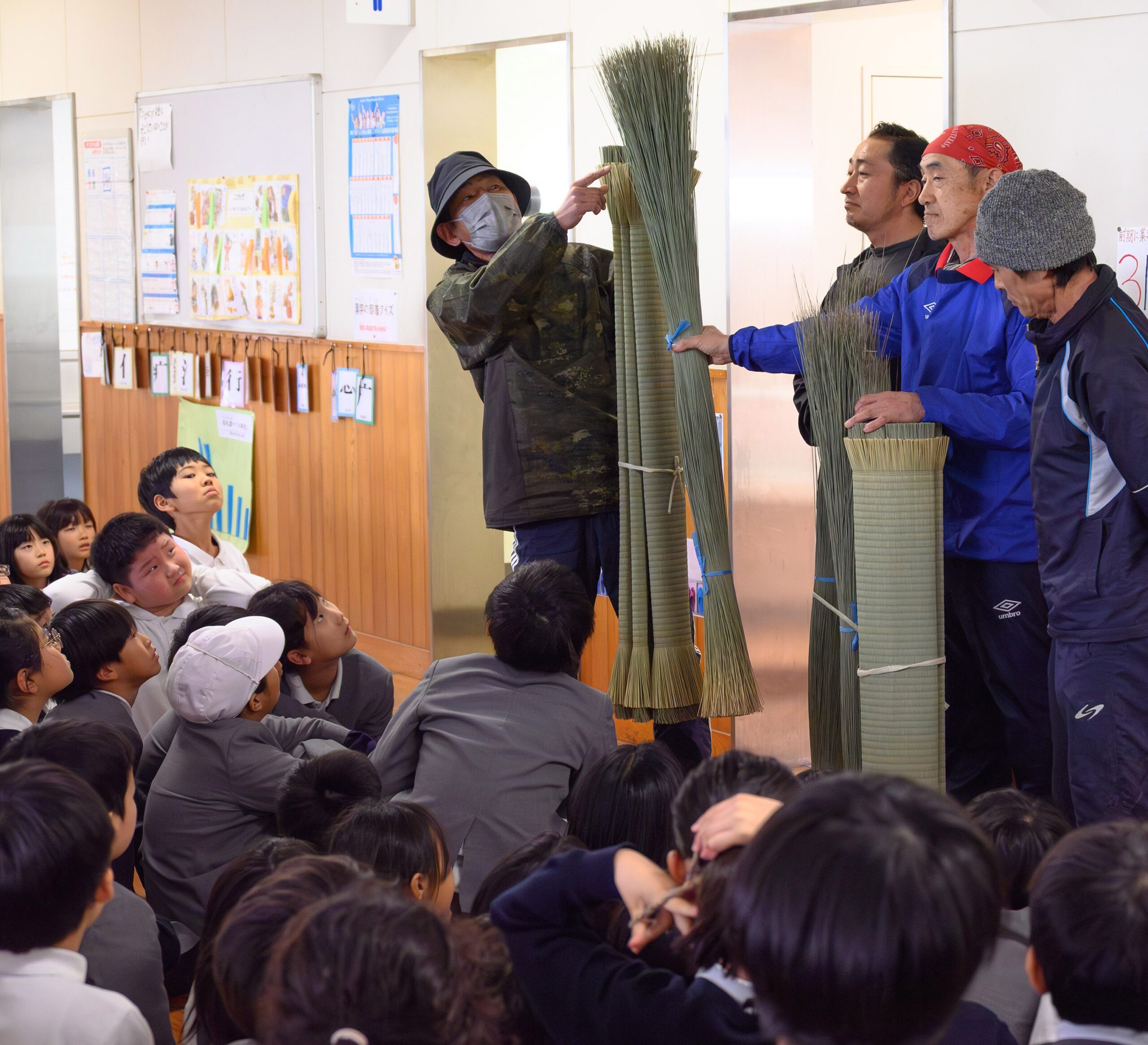 同会の奥村秀信会長は「イ草や畳表を手にした児童たちが喜んでいる姿を見られてうれしい。この授業を通して、地元の特産であるイ草に親しみをもってもらいたい」と話した。