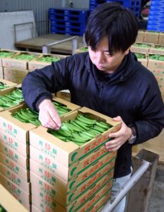 JA熊本うき管内で、スナップエンドウが出荷ピークを迎えた。宇城市三角町の西営農センター園芸集荷所では、日量約500ケース(1ケース1キロ箱)を出荷。担当者らは出荷作業に忙しい。